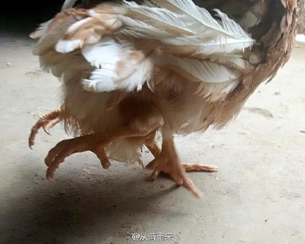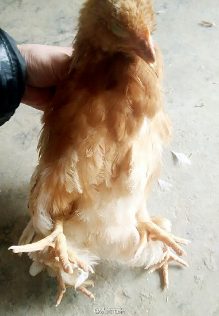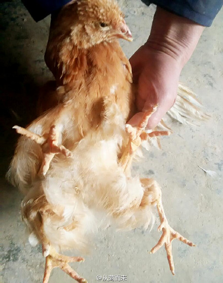 朱女士家經(jīng)營著一座養(yǎng)雞場,由她的父親打理。今天上午,朱女士的父親從養(yǎng)雞場帶回了一只四條腿的雞。這只雞除了正常的兩條腿外,尾部還長了兩只向后伸直的腿。朱女士見到后感到十分驚奇,隨即拍照并發(fā)了微薄。