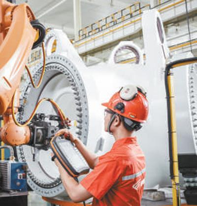 工人在新疆金風(fēng)科技股份有限公司哈密總裝智能生產(chǎn)線上進(jìn)行數(shù)控操作。發(fā)