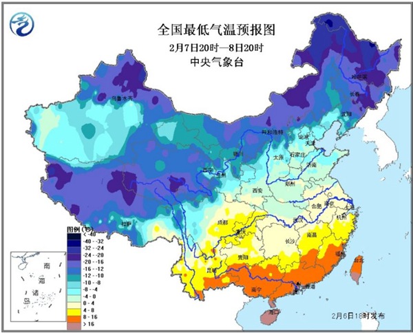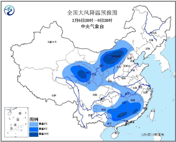 中國天氣網(wǎng)訊 中央氣象臺2月6日18時發(fā)布寒潮藍色預(yù)警: