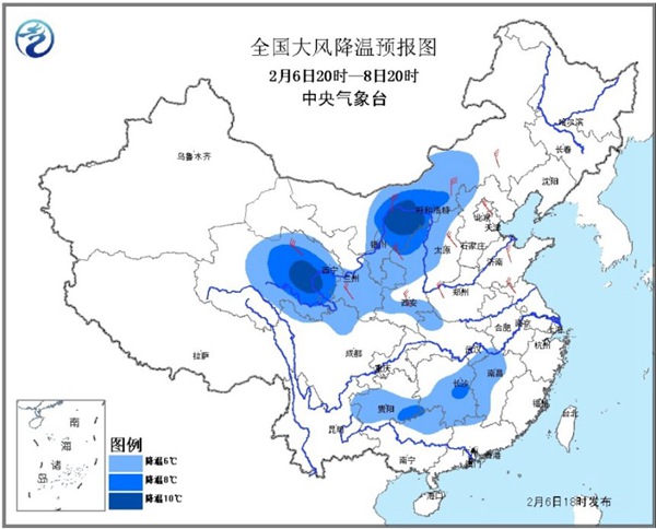 預(yù)計6日20時至8日20時,西北地區(qū)東部、內(nèi)蒙古中西部、山西西部、貴州大部、江南中西部和廣西北部等地的部分地區(qū)將出現(xiàn)6℃以上降溫,其中青海東部、陜西北部、內(nèi)蒙古中部、貴州東南部和湖南東南部等地的部分地區(qū)降溫幅度可達8℃以上,局地超過10℃。上述北方地區(qū)并伴有4~6級偏北風(fēng)。