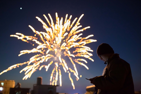 1月27日,除夕,江蘇省連云港市灌云縣四隊鎮(zhèn),人們在大街小巷燃放煙花爆竹。視覺中國供圖