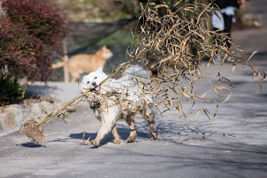 1月28日,浙江金華,一只薩摩耶犬從野外拖回一根竹子回家。它跟著主人一起回老家過年,在田地里撒野,變成全身沾滿泥巴的農(nóng)村“土”狗。視覺中國供圖