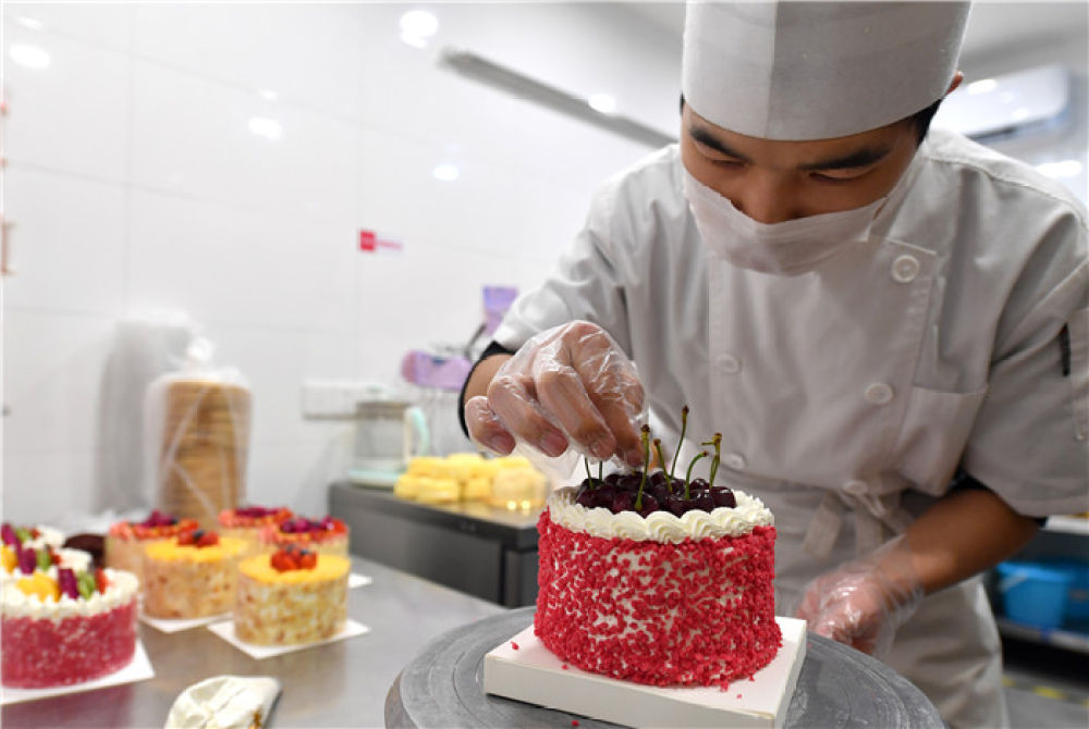 烘焙師在鄭州一家蛋糕店內(nèi)制作車厘子蛋糕(12月6日攝)。新華社記者 李嘉南 攝
