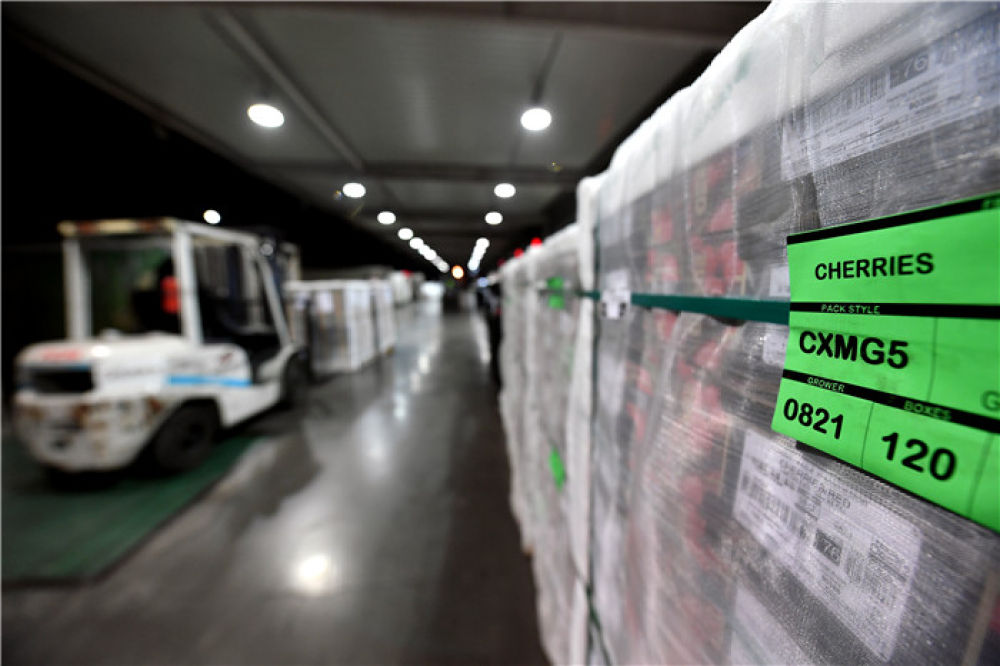工作人員在鄭州新鄭國際機場西貨站搬運車厘子(12月8日攝)。新華社記者 李嘉南 攝