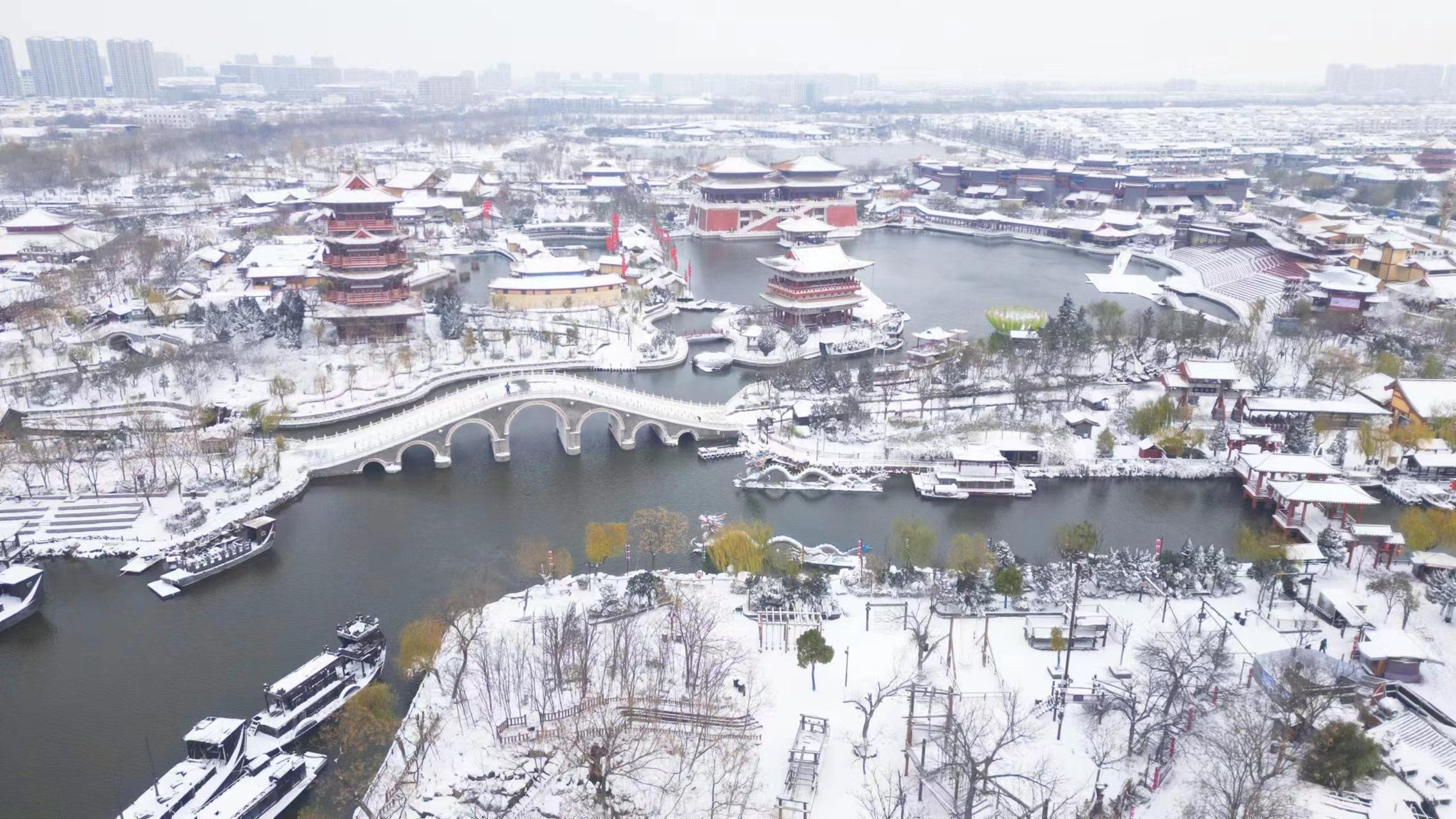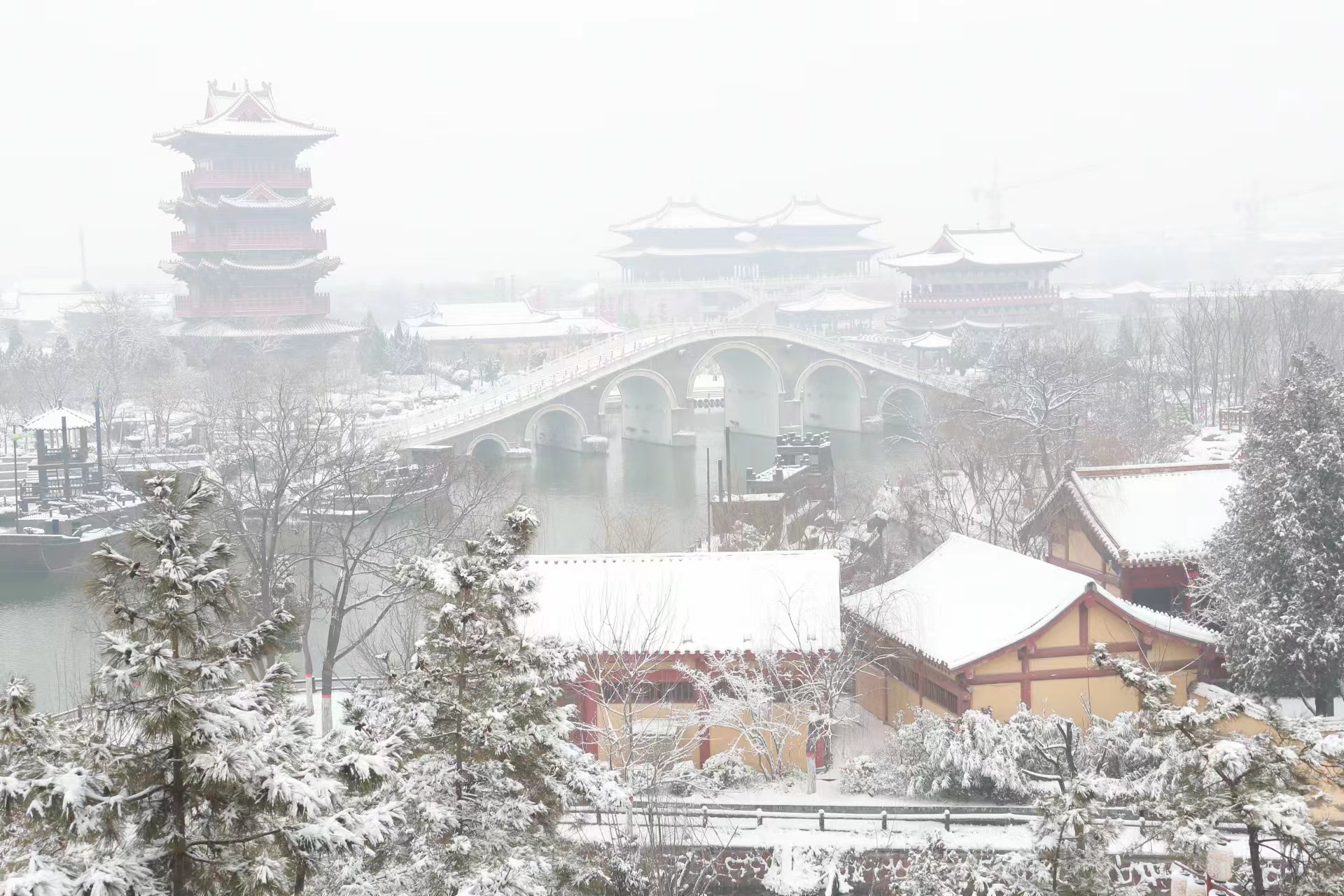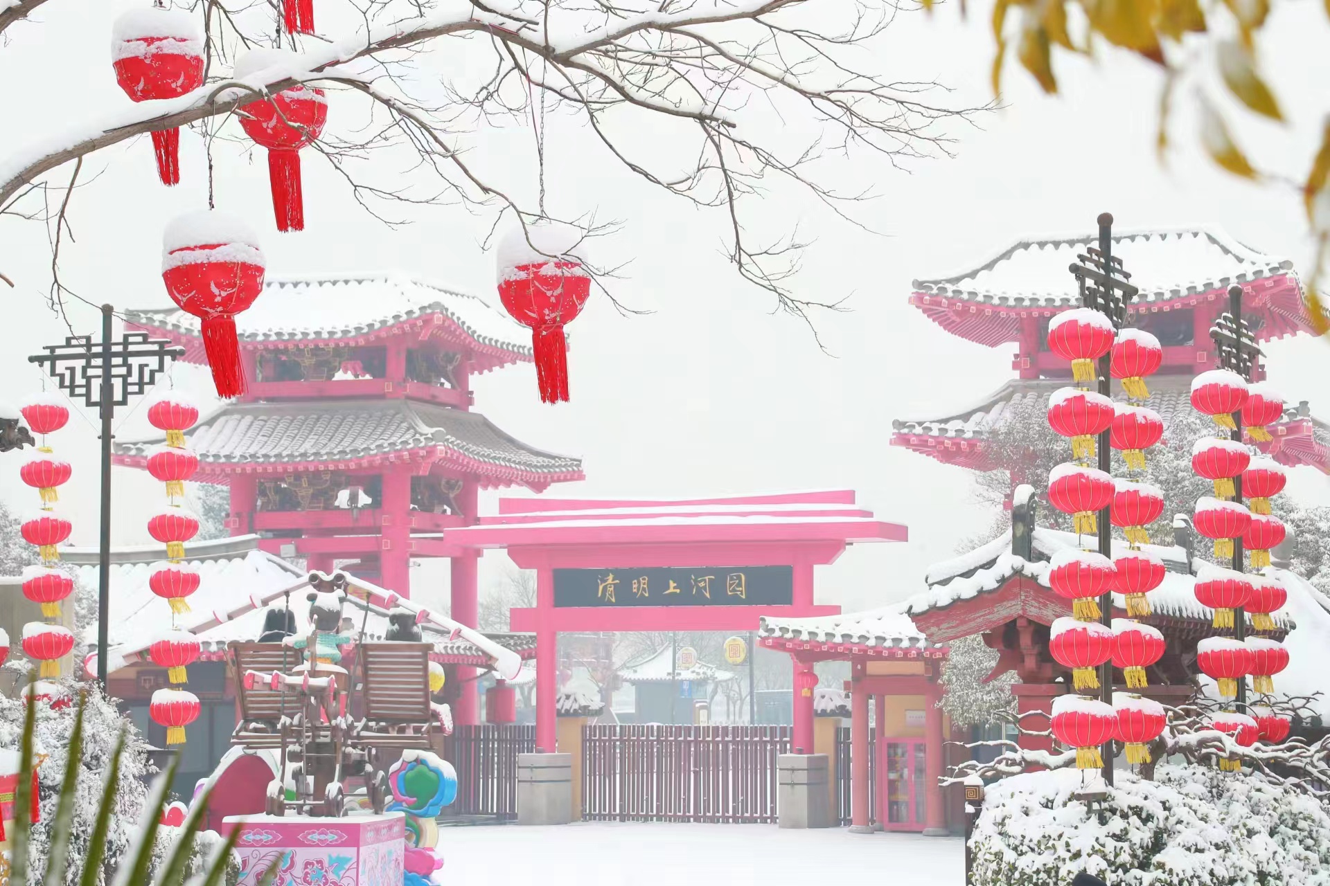 虹橋、上善門、拂云閣、禧墻、九龍橋、雙亭橋……雪花飛舞肆意灑脫,點點揚花,片片鵝毛。步入畫卷賞雪景,夢回千年共白頭。雪景加持,這是屬于宋代的冬日風(fēng)雅頌,畫面一展,這是屬于清明上河園的浪漫詩篇。