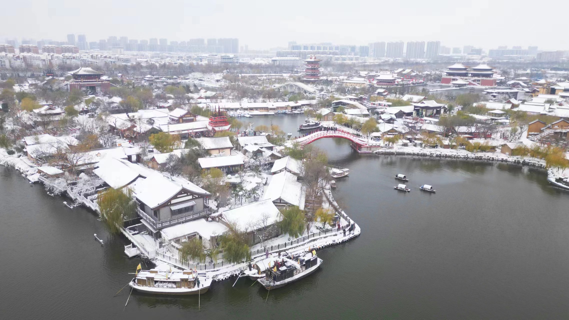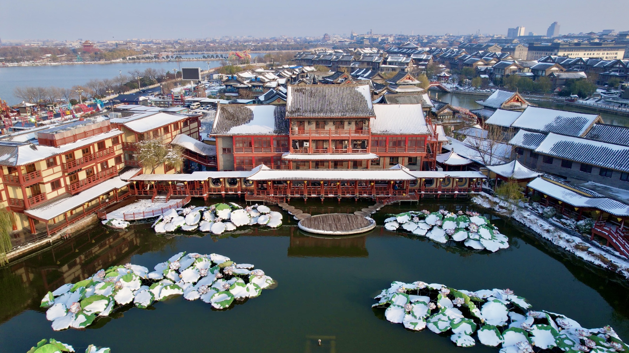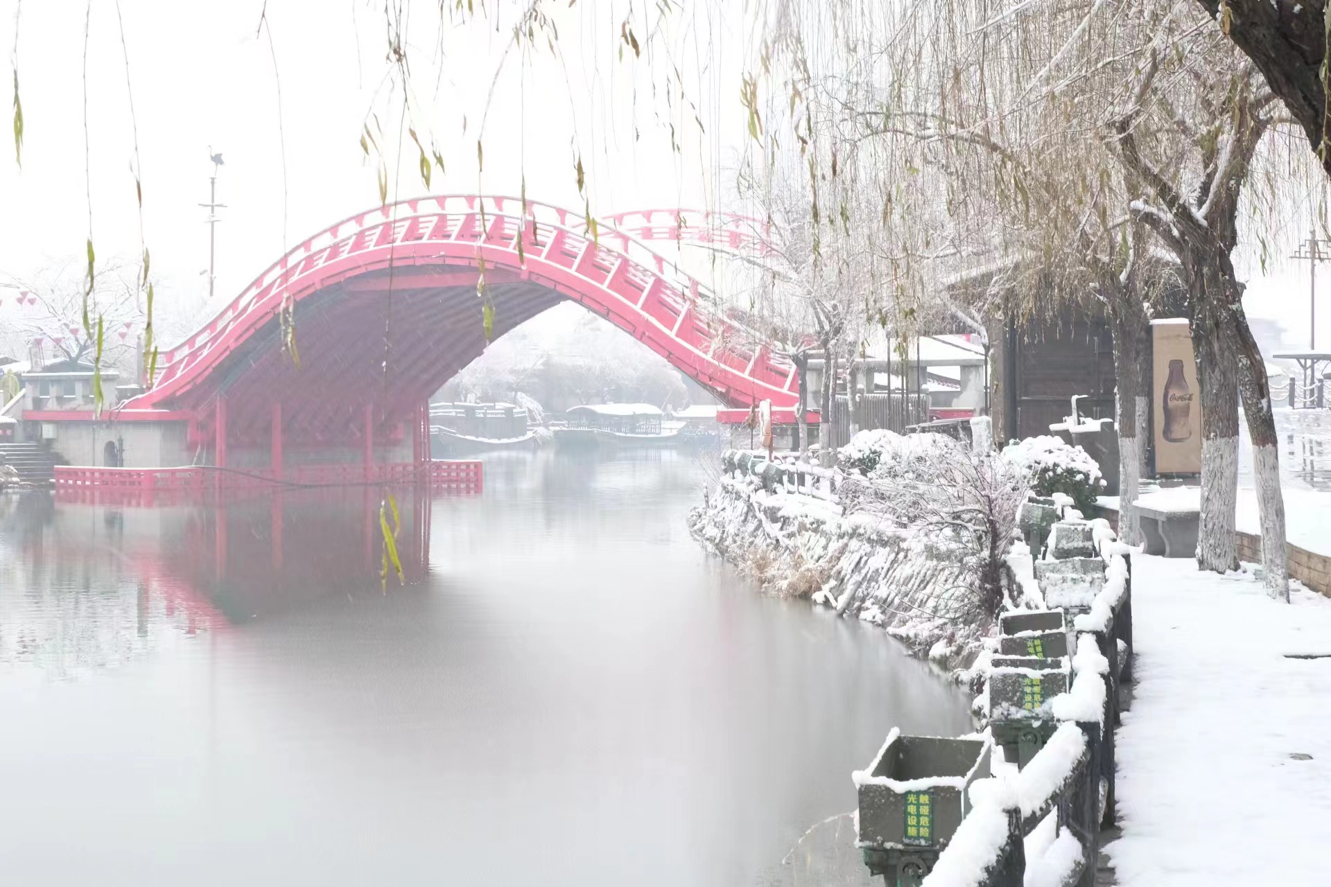 虹橋、上善門、拂云閣、禧墻、九龍橋、雙亭橋……雪花飛舞肆意灑脫,點點揚花,片片鵝毛。步入畫卷賞雪景,夢回千年共白頭。雪景加持,這是屬于宋代的冬日風(fēng)雅頌,畫面一展,這是屬于清明上河園的浪漫詩篇。