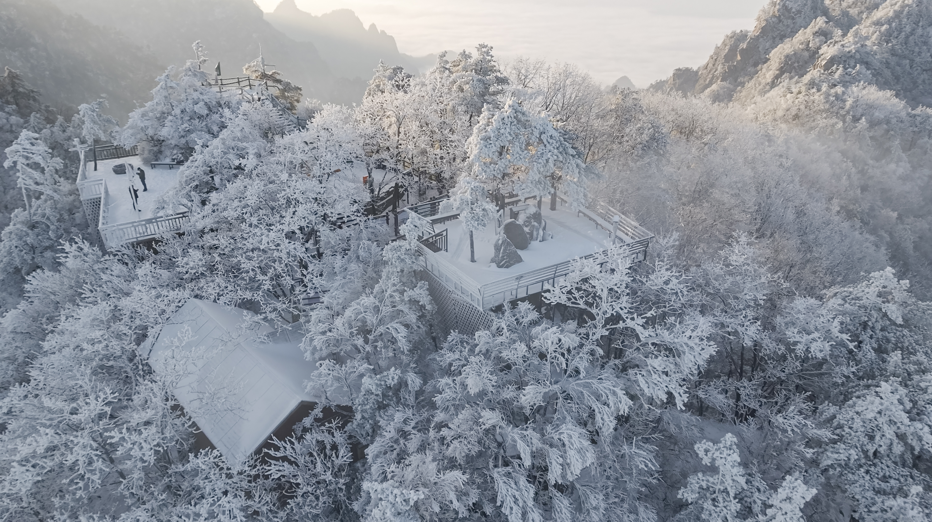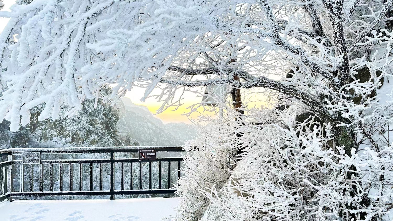 放眼望去,玉樹瓊枝,云海翻騰,浪漫唯美,整個景區(qū)仿佛成了一個銀裝素裹、晶瑩剔透的冰雪童話世界。