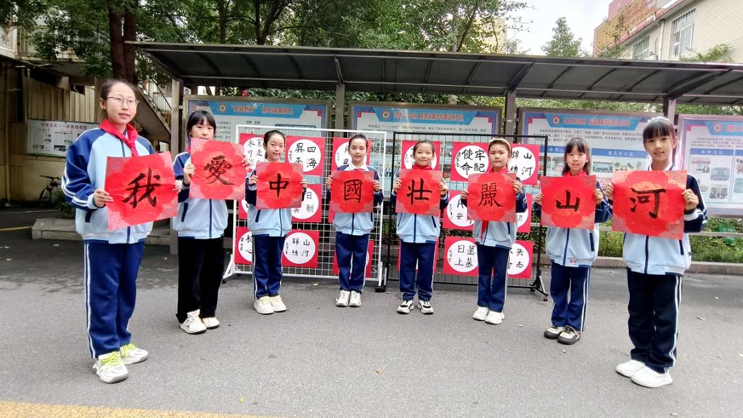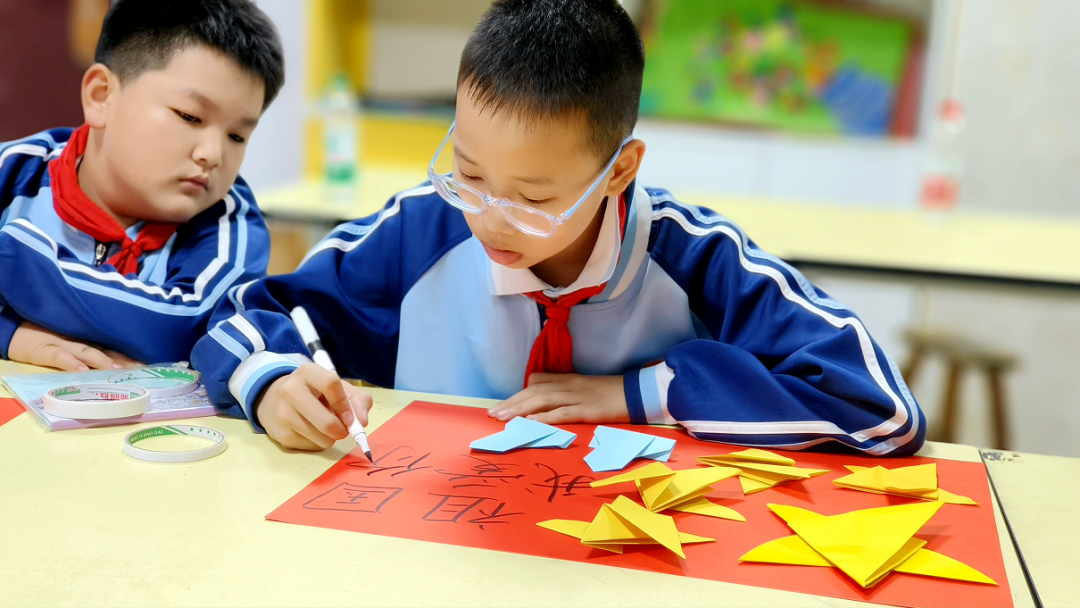 藝術(shù)創(chuàng)作展區(qū)同樣精彩紛呈。六年級學(xué)生圍繞“國慶”主題創(chuàng)作手抄報,天安門、五星紅旗、航天火箭等元素躍然紙上,色彩絢麗且滿含巧思;書法社團成員揮毫潑墨,“山河壯麗”“我愛中國”等書法作品筆力遒勁,墨香氤氳中滿是對家國的深厚情誼。折紙與創(chuàng)意畫社團則帶來“紅色記憶”主題作品展,精巧的五角星窗花、溫馨的“天安門日出”創(chuàng)意畫,將傳統(tǒng)技藝與愛國情懷完美融合,每一件作品都是孩子們對祖國最純真、最真摯的祝福。