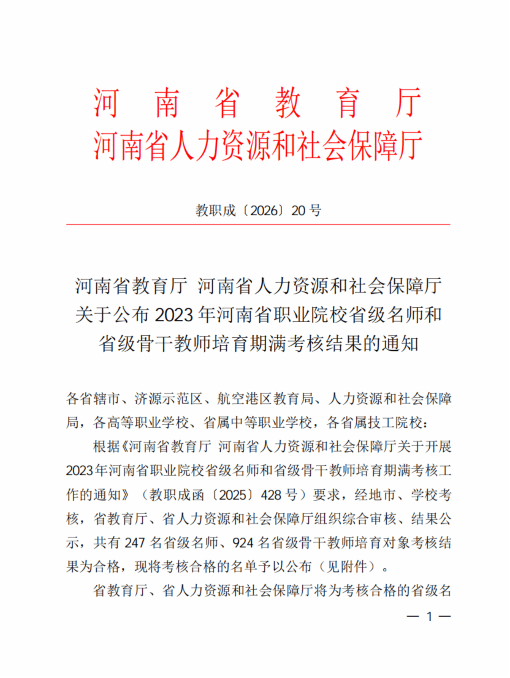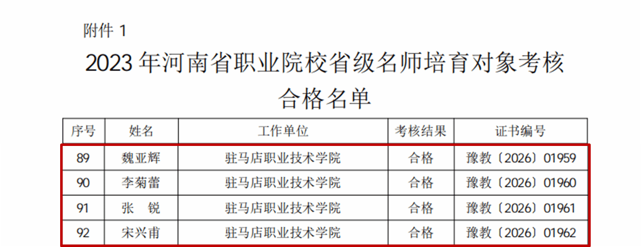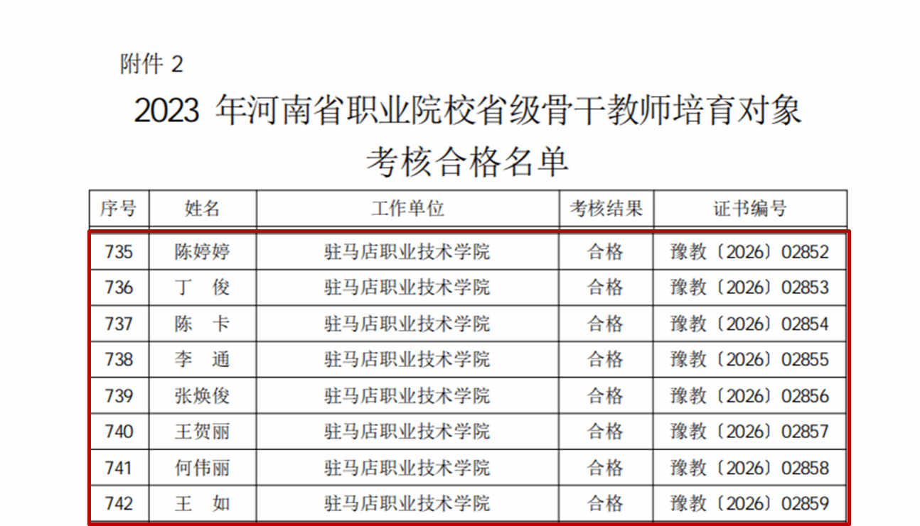 近日,河南省教育廳與河南省人力資源和社會(huì)保障廳聯(lián)合發(fā)布《關(guān)于公布2023年河南省職業(yè)院校省級(jí)名師和省級(jí)骨干教師培育期滿考核結(jié)果的通知》(教職成〔2026〕20號(hào)),駐馬店職業(yè)技術(shù)學(xué)院多名教師考核合格,分別榮獲省級(jí)名師和省級(jí)骨干教師稱號(hào)。