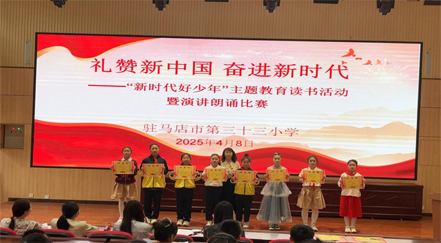 為深化愛國主義教育,引導(dǎo)學(xué)生樹立愛黨愛國情懷,增強(qiáng)民族自豪感,展現(xiàn)新時(shí)代少年兒童的精神風(fēng)貌,提升學(xué)生的語言表達(dá)能力和綜合素質(zhì)。4月8日,駐馬店市第三十三小學(xué)在學(xué)校報(bào)告廳開展了“新時(shí)代好少年”主題教育讀書活動暨演講朗誦比賽活動。