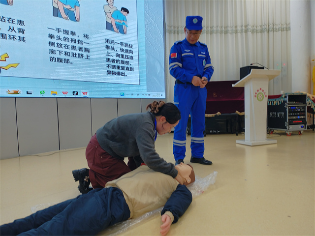 為使理論與實(shí)踐緊密結(jié)合,救援隊(duì)員們在講解后現(xiàn)場進(jìn)行了規(guī)范的操作演示。從判斷環(huán)境安全、檢查意識到胸外按壓的正確姿勢、頻率與深度,再到人工呼吸的技巧;針對海姆立克急救法操作手法,一一進(jìn)行了細(xì)致展示。