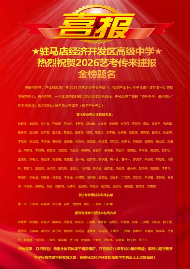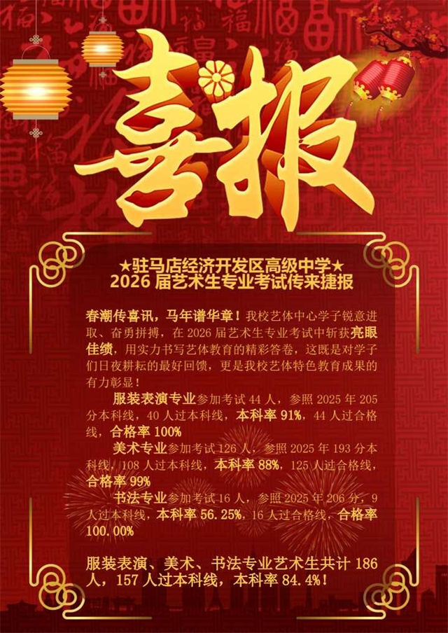 在此,向所有取得優(yōu)異成績的2026屆藝術(shù)生致以最熱烈的祝賀!向辛勤付出的專業(yè)教師團隊、默默支持的家長及社會各界表示最誠摯的感謝!未來,駐馬店經(jīng)濟開發(fā)區(qū)高級中學將繼續(xù)秉持藝體教育初心,深耕特色育人之路,為學子們搭建更廣闊的成長舞臺,助力更多藝術(shù)追夢人奔赴理想前程,再創(chuàng)教育新輝煌!