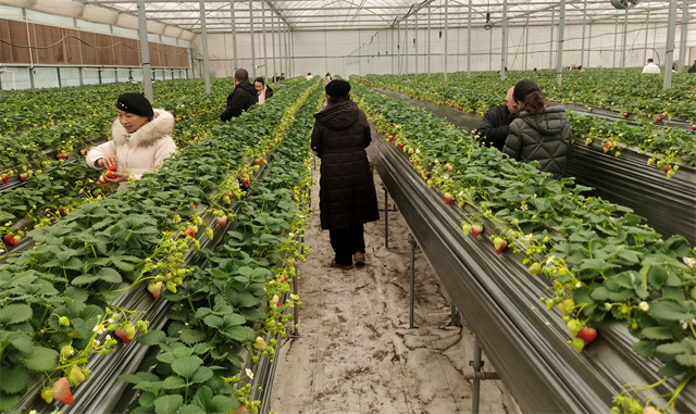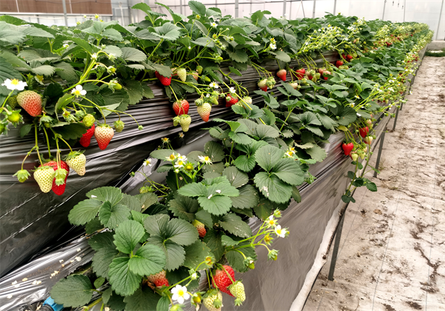 目前,草莓進(jìn)入盛果期,畝產(chǎn)量可達(dá)5000斤,采摘期將持續(xù)至五月份。